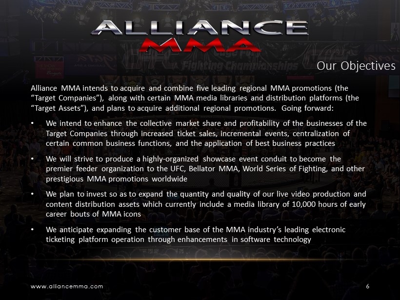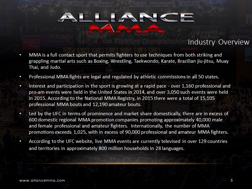 www.alliancemma.com 4 Who We Are Alliance MMA intends to create the premier promotional showcase for aspiring mixed martial arts (MMA) fighters to advance to the sport’s highest level of professional competition . We expect to achieve our goal by acquiring successful regional promotions and, in order to expand our MMA fan base, by acquiring and developing a world - class media production and distribution operation, as well as an electronic ticketing platform .