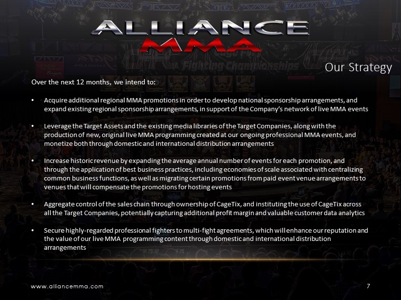 Alliance MMA intends to acquire and combine five leading regional MMA promotions (the “Target Companies”), along with certain MMA media libraries and distribution platforms (the “Target Assets”), and plans to acquire additional regional promotions. Going forward: • We intend to enhance the collective market share and profitability of the businesses of the Target Companies through increased ticket sales, incremental events, centralization of certain common business functions, and the application of best business practices • We will strive to produce a highly - organized showcase event conduit to become the premier feeder organization to the UFC, Bellator MMA, World Series of Fighting, and other prestigious MMA promotions worldwide • We plan to invest so as to expand the quantity and quality of our live video production and content distribution assets which currently include a media library of 10,000 hours of early career bouts of MMA icons • We anticipate expanding the customer base of the MMA industry’s leading electronic ticketing platform operation through enhancements in software technology Our Objectives www.alliancemma.com 6