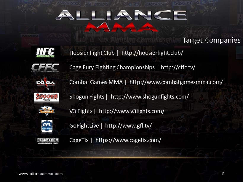 www.alliancemma.com 8 Target Companies Hoosier Fight Club Cage Fury Fighting Championships Combat Games MMA Shogun Fights V3 Fights GoFightLive CageTix * (click the logos)