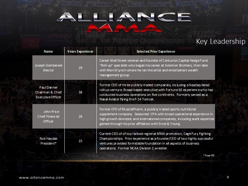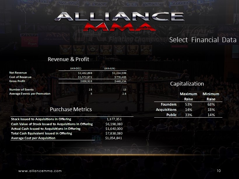Key Leadership www.alliancemma.com 9 Name Years Experience Selected Prior Experience Joseph Gamberale Diector 29 Career Wall Street veteran and founder of Centurion Capital Hedge Fund. “Roll-up” specialist who began his career at Solomon Brothers, then later with Merrill Lynch where he ran the artist and entertainers wealth management group. Paul Danner Chairman & Chief Executive Officer 38 Former CEO of three publicly traded companies, including a Nasdaq-listed roll-up venture. Broad-based executive with Fortune 50 experience who has conducted business operations on five continents. Formerly served as a Naval Aviator flying the F-14 Tomcat. John Price Chief Financial Officer 26 Former CFO of MusclePharm, a publicly traded sports nutritional supplement company. Seasoned CPA with broad operational experience in high growth domestic and international companies, including audit expertise gained through his prior affiliation with Ernst & Young. Rob Haydak President* 25 Current CEO of of top ranked regional MMA promotion, Cage Fury Fighting Championships. Prior experience as a founder/CEO of two highly successful ventures provided formidable foundation in all aspects of business operations. Former NCAA Division 1 wrestler. * Post-IPO