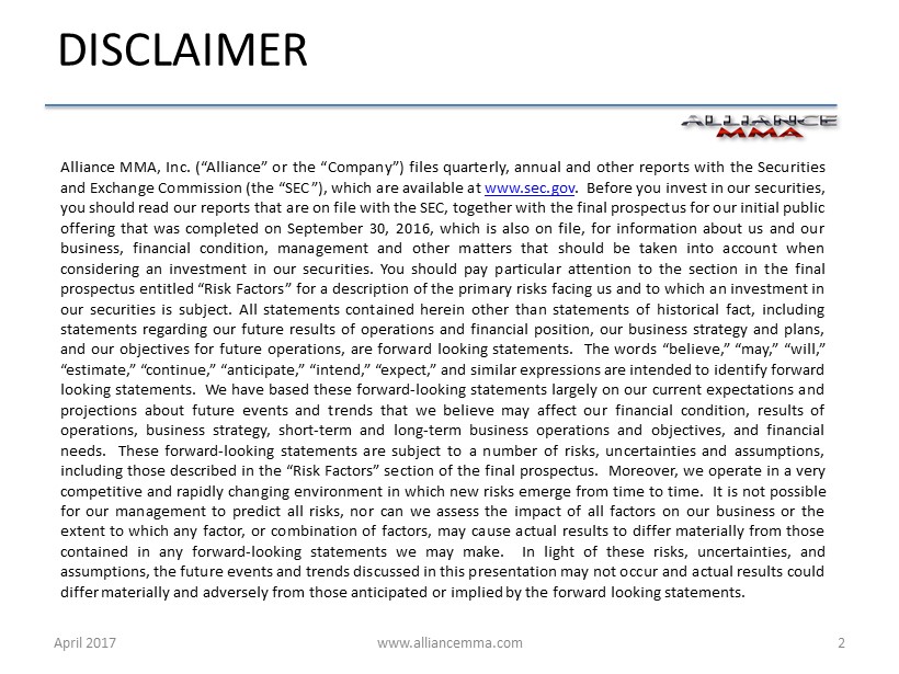 www.alliancemma.com April 2017 2 Alliance MMA, Inc . (“Alliance” or the “Company”) files quarterly, annual and other reports with the Securities and Exchange Commission (the “SEC”), which are available at www . sec . gov . Before you invest in our securities, you should read our reports that are on file with the SEC, together with the final prospectus for our initial public offering that was completed on September 30 , 2016 , which is also on file, for information about us and our business, financial condition, management and other matters that should be taken into account when considering an investment in our securities . You should pay particular attention to the section in the final prospectus entitled “Risk Factors” for a description of the primary risks facing us and to which an investment in our securities is subject . All statements contained herein other than statements of historical fact, including statements regarding our future results of operations and financial position, our business strategy and plans, and our objectives for future operations, are forward looking statements . The words “believe,” “may,” “will,” “estimate,” “continue,” “anticipate,” “intend,” “expect,” and similar expressions are intended to identify forward looking statements . We have based these forward - looking statements largely on our current expectations and projections about future events and trends that we believe may affect our financial condition, results of operations, business strategy, short - term and long - term business operations and objectives, and financial needs . These forward - looking statements are subject to a number of risks, uncertainties and assumptions, including those described in the “Risk Factors” section of the final prospectus . Moreover, we operate in a very competitive and rapidly changing environment in which new risks emerge from time to time . It is not possible for our management to predict all risks, nor can we assess the impact of all factors on our business or the extent to which any factor, or combination of factors, may cause actual results to differ materially from those contained in any forward - looking statements we may make . In light of these risks, uncertainties, and assumptions, the future events and trends discussed in this presentation may not occur and actual results could differ materially and adversely from those anticipated or implied by the forward looking statements . DISCLAIMER