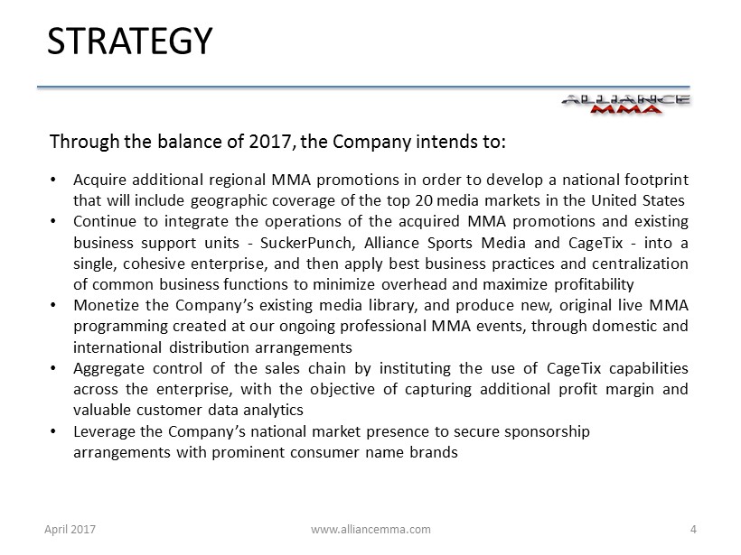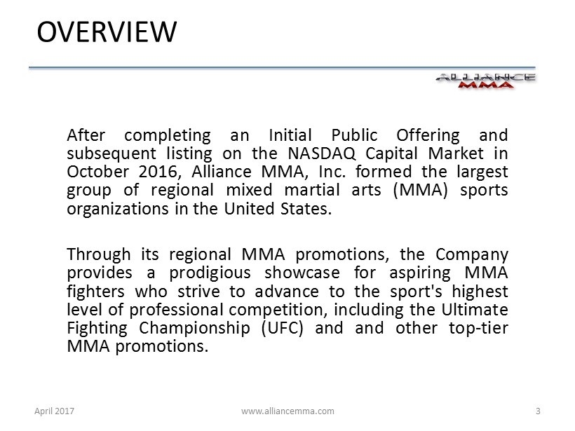 www.alliancemma.com After completing an Initial Public Offering and subsequent listing on the NASDAQ Capital Market in October 2016 , Alliance MMA, Inc . formed the largest group of regional mixed martial arts (MMA) sports organizations in the United States . Through its regional MMA promotions, the Company provides a prodigious showcase for aspiring MMA fighters who strive to advance to the sport's highest level of professional competition, including the Ultimate Fighting Championship (UFC) and and other top - tier MMA promotions . April 2017 3 OVERVIEW