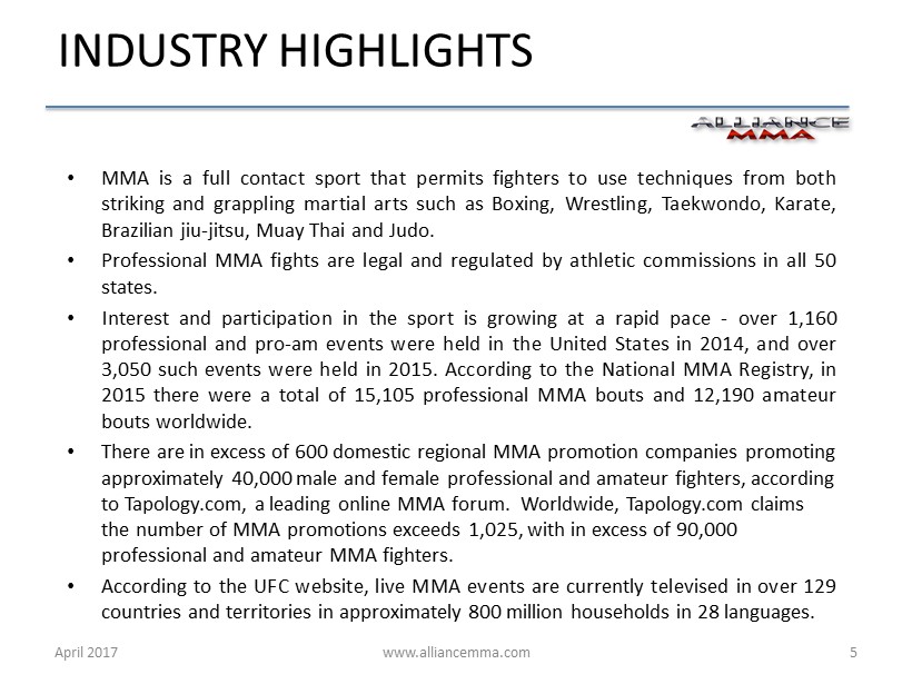www.alliancemma.com April 2017 4 STRATEGY Through the balance of 2017 , the Company intends to : • Acquire additional regional MMA promotions in order to develop a national footprint that will include geographic coverage of the top 20 media markets in the United States • Continue to integrate the operations of the acquired MMA promotions and existing business support units - SuckerPunch, Alliance Sports Media and CageTix - into a single, cohesive enterprise, and then apply best business practices and centralization of common business functions to minimize overhead and maximize profitability • Monetize the Company’s existing media library, and produce new, original live MMA programming created at our ongoing professional MMA events, through domestic and international distribution arrangements • Aggregate control of the sales chain by instituting the use of CageTix capabilities across the enterprise, with the objective of capturing additional profit margin and valuable customer data analytics • Leverage the Company’s national market presence to secure sponsorship arrangements with prominent consumer name brands