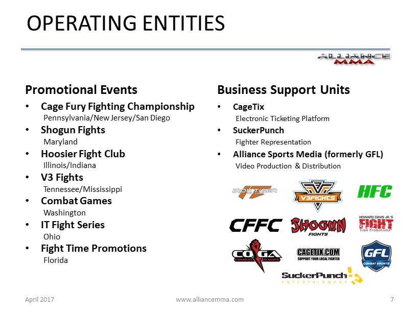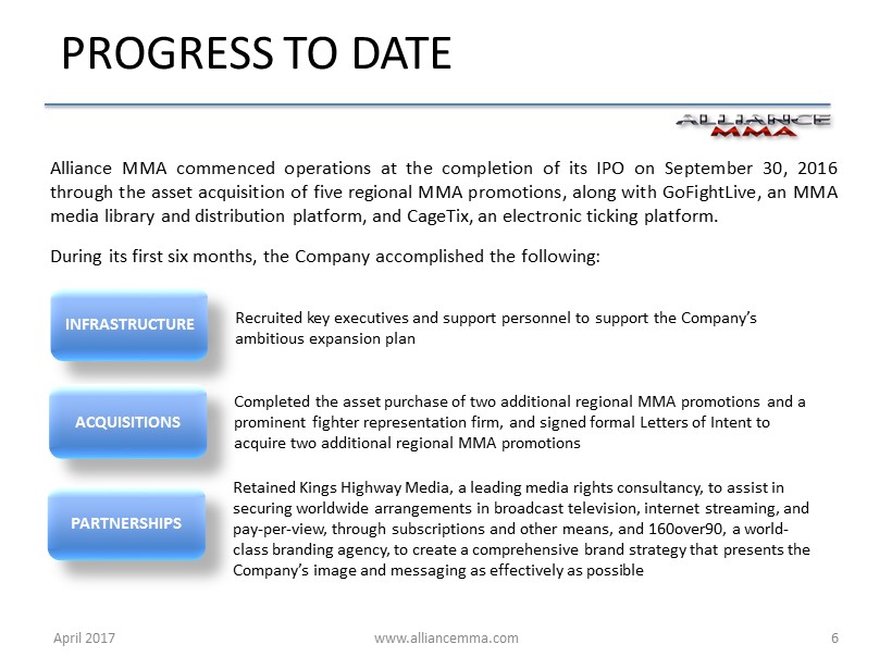 www.alliancemma.com Alliance MMA commenced operations at the completion of its IPO on September 30 , 2016 through the asset acquisition of five regional MMA promotions, along with GoFightLive, an MMA media library and distribution platform, and CageTix, an electronic ticking platform . During its first six months, the Company accomplished the following : INFRASTRUCTURE PARTNERSHIPS ACQUISITIONS April 2017 6 PROGRESS TO DATE Recruited key executives and support personnel to support the Company’s ambitious expansion plan Completed the asset purchase of two additional regional MMA promotions and a prominent fighter representation firm, and signed formal Letters of Intent to acquire two additional regional MMA promotions Retained Kings Highway Media, a leading media rights consultancy, to assist in securing worldwide arrangements in broadcast television, internet streaming, and pay - per - view, through subscriptions and other means, and 160over90, a world - class branding agency, to create a comprehensive brand strategy that presents the Company’s image and messaging as effectively as possible