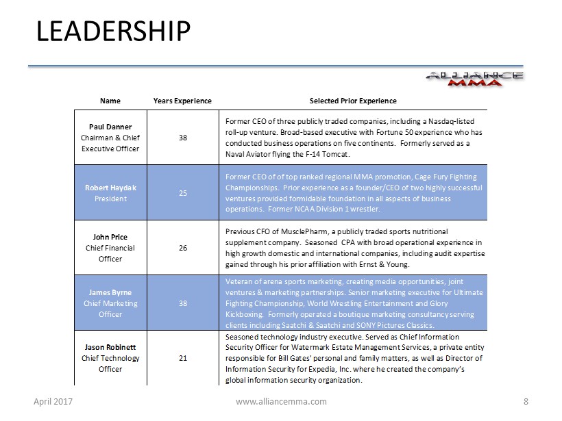 www.alliancemma.com Promotional Events • Cage Fury Fighting Championship Pennsylvania/New Jersey/San Diego • Shogun Fights Maryland • Hoosier Fight Club Illinois/Indiana • V3 Fights Tennessee/Mississippi • Combat Games Washington • IT Fight Series Ohio • Fight Time Promotions Florida Business Support Units • CageTix Electronic Ticketing Platform • SuckerPunch Fighter Representation • Alliance Sports Media (formerly GFL) Video Production & Distribution April 2017 7 OPERATING ENTITIES