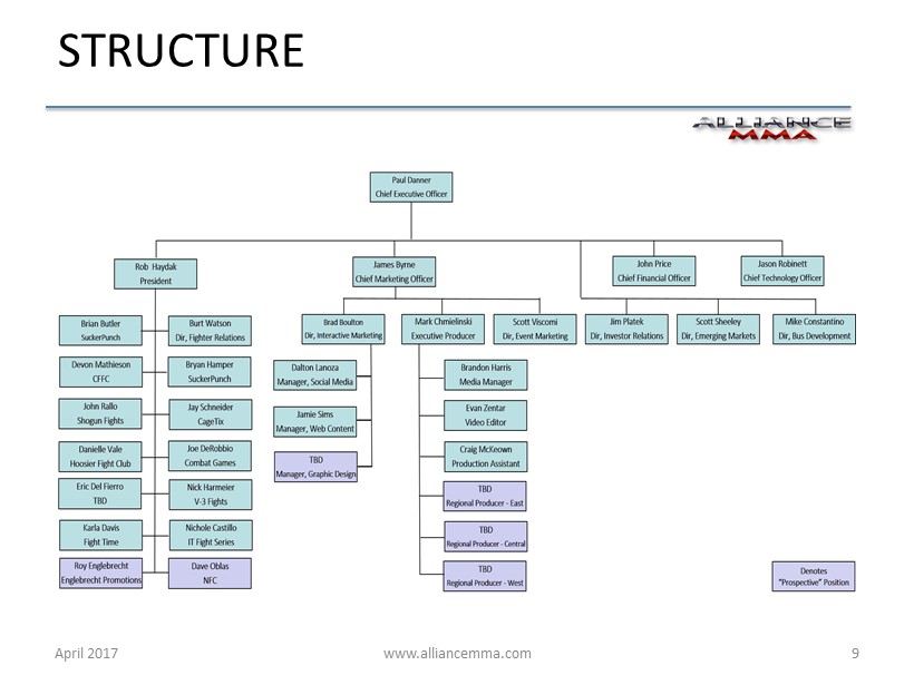 www.alliancemma.com April 2017 8 LEADERSHIP Name Years Experience Selected Prior Experience Paul Danner Chairman & Chief Executive Officer 38 Former CEO of three publicly traded companies, including a Nasdaq-listed roll-up venture. Broad-based executive with Fortune 50 experience who has conducted business operations on five continents. Formerly served as a Naval Aviator flying the F-14 Tomcat. Robert Haydak President 25 Former CEO of of top ranked regional MMA promotion, Cage Fury Fighting Championships. Prior experience as a founder/CEO of two highly successful ventures provided formidable foundation in all aspects of business operations. Former NCAA Division 1 wrestler. John Price Chief Financial Officer 26 Previous CFO of MusclePharm, a publicly traded sports nutritional supplement company. Seasoned CPA with broad operational experience in high growth domestic and international companies, including audit expertise gained through his prior affiliation with Ernst & Young. James Byrne Chief Marketing Officer 38 Veteran of arena sports marketing, creating media opportunities, joint ventures & marketing partnerships. Senior marketing executive for Ultimate Fighting Championship, World Wrestling Entertainment and Glory Kickboxing. Formerly operated a boutique marketing consultancy serving clients including Saatchi & Saatchi and SONY Pictures Classics. Jason Robinett Chief Technology Officer 21 Seasoned technology industry executive. Served as Chief Information Security Officer for Watermark Estate Management Services, a private entity responsible for Bill Gates' personal and family matters, as well as Director of Information Security for Expedia, Inc. where he created the company’s global information security organization.