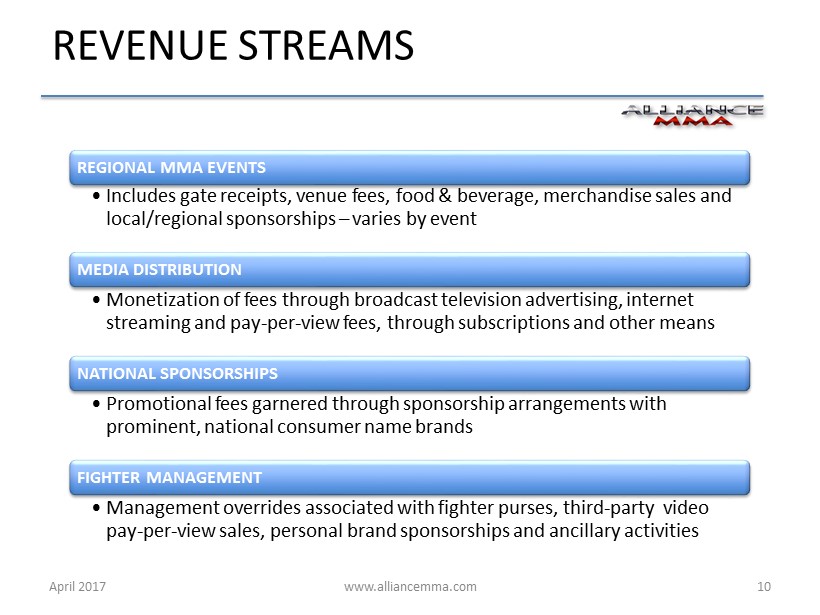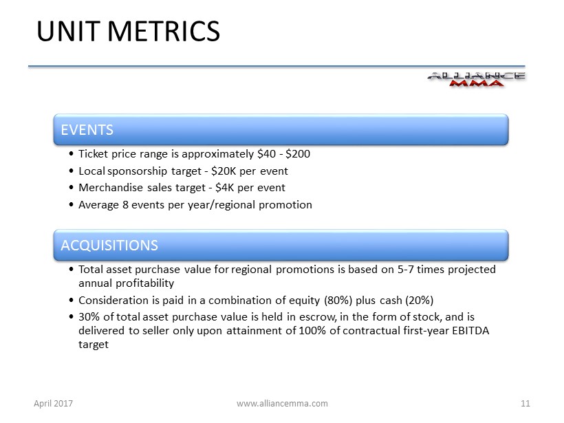 www.alliancemma.com April 2017 10 REVENUE STREAMS REGIONAL MMA EVENTS • Includes gate receipts, venue fees, food & beverage, merchandise sales and local/regional sponsorships – varies by event MEDIA DISTRIBUTION • Monetization of fees through broadcast television advertising, internet streaming and pay - per - view fees, through subscriptions and other means NATIONAL SPONSORSHIPS • Promotional fees garnered through sponsorship arrangements with prominent, national consumer name brands FIGHTER MANAGEMENT • Management overrides associated with fighter purses, third - party video pay - per - view sales, personal brand sponsorships and ancillary activities