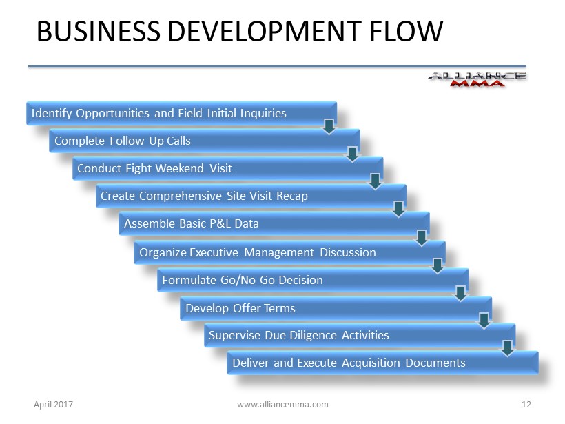 www.alliancemma.com April 2017 12 BUSINESS DEVELOPMENT FLOW Identify Opportunities and Field Initial Inquiries Complete Follow Up Calls Conduct Fight Weekend Visit Create Comprehensive Site Visit Recap Assemble Basic P&L Data Organize Executive Management Discussion Formulate Go/No Go Decision Develop Offer Terms Supervise Due Diligence Activities Deliver and Execute Acquisition Documents
