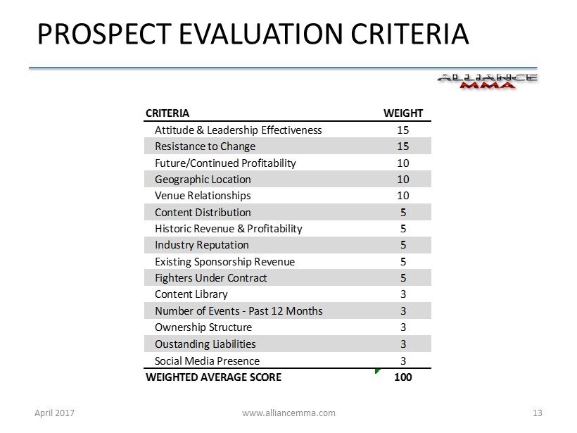 www.alliancemma.com April 2017 13 PROSPECT EVALUATION CRITERIA CRITERIA WEIGHT Attitude & Leadership Effectiveness 15 Resistance to Change 15 Future/Continued Profitability 10 Geographic Location 10 Venue Relationships 10 Content Distribution 5 Historic Revenue & Profitability 5 Industry Reputation 5 Existing Sponsorship Revenue 5 Fighters Under Contract 5 Content Library 3 Number of Events - Past 12 Months 3 Ownership Structure 3 Oustanding Liabilities 3 Social Media Presence 3 WEIGHTED AVERAGE SCORE 100