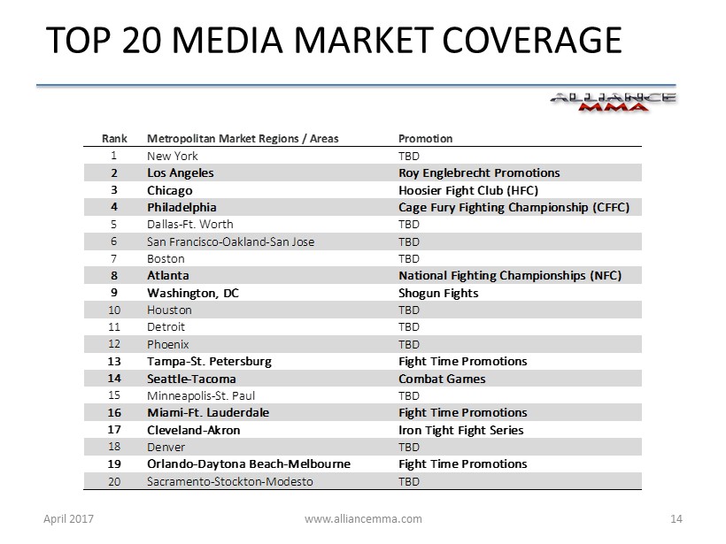 www.alliancemma.com April 2017 14 TOP 20 MEDIA MARKET COVERAGE Rank Metropolitan Market Regions / Areas Promotion 1 New York TBD 2 Los Angeles Roy Englebrecht Promotions 3 Chicago Hoosier Fight Club (HFC) 4 Philadelphia Cage Fury Fighting Championship (CFFC) 5 Dallas-Ft. Worth TBD 6 San Francisco-Oakland-San Jose TBD 7 Boston TBD 8 Atlanta National Fighting Championships (NFC) 9 Washington, DC Shogun Fights 10 Houston TBD 11 Detroit TBD 12 Phoenix TBD 13 Tampa-St. Petersburg Fight Time Promotions 14 Seattle-Tacoma Combat Games 15 Minneapolis-St. Paul TBD 16 Miami-Ft. Lauderdale Fight Time Promotions 17 Cleveland-Akron Iron Tight Fight Series 18 Denver TBD 19 Orlando-Daytona Beach-Melbourne Fight Time Promotions 20 Sacramento-Stockton-Modesto TBD