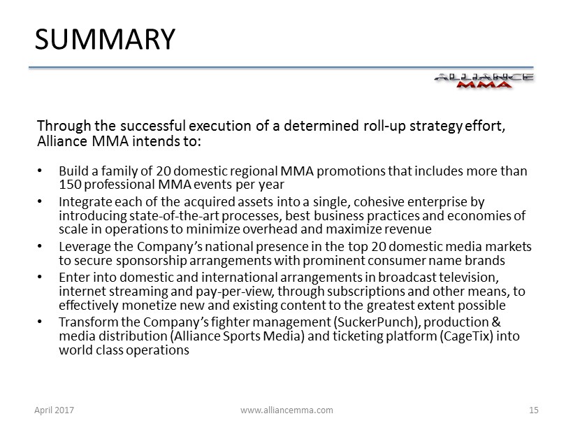 www.alliancemma.com Through the successful execution of a determined roll - up strategy effort, Alliance MMA intends to: • Build a family of 20 domestic regional MMA promotions that includes more than 150 professional MMA events per year • Integrate each of the acquired assets into a single, cohesive enterprise by introducing state - of - the - art processes, best business practices and economies of scale in operations to minimize overhead and maximize revenue • Leverage the Company’s national presence in the top 20 domestic media markets to secure sponsorship arrangements with prominent consumer name brands • Enter into domestic and international arrangements in broadcast television, internet streaming and pay - per - view, through subscriptions and other means, to effectively monetize new and existing content to the greatest extent possible • Transform the Company’s fighter management (SuckerPunch), production & media distribution (Alliance Sports Media) and ticketing platform (CageTix) into world class operations April 2017 15 SUMMARY
