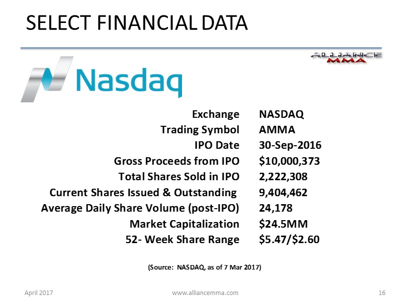 www.alliancemma.com April 2017 16 SELECT FINANCIAL DATA Exchange NASDAQ Trading Symbol AMMA IPO Date 30-Sep-2016 Gross Proceeds from IPO $10,000,373 Total Shares Sold in IPO 2,222,308 Current Shares Issued & Outstanding 9,404,462 Average Daily Share Volume (post-IPO) 24,178 Market Capitalization $24.5MM 52- Week Share Range $5.47/$2.60 (Source: NASDAQ, as of 7 Mar 2017)
