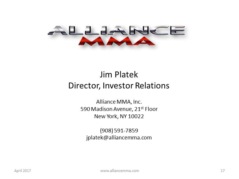 www.alliancemma.com April 2017 17 Jim Platek Director, Investor Relations Alliance MMA, Inc. 590 Madison Avenue, 21 st Floor New York, NY 10022 (908) 591 - 7859 jplatek@alliancemma.com