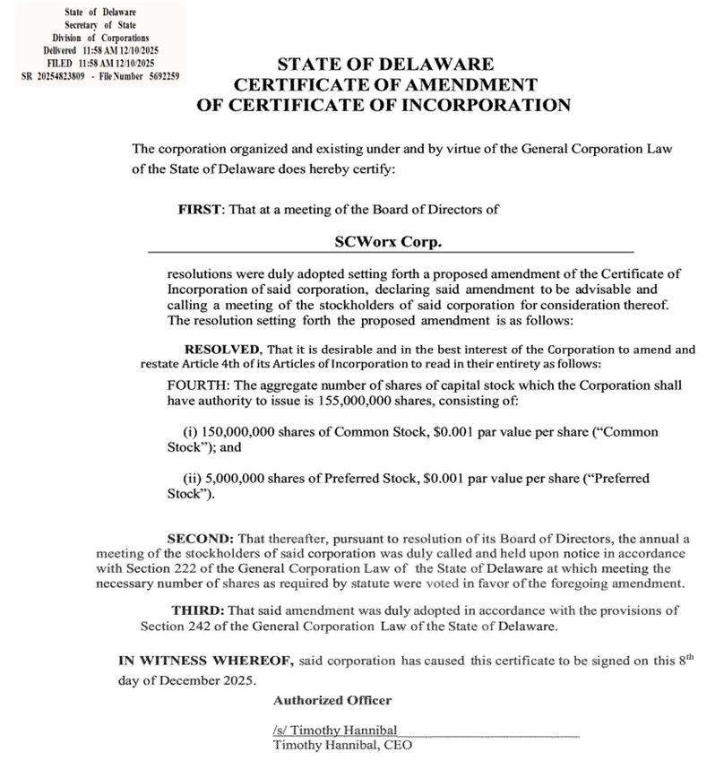 I, JEFFREY W. BULLOCK, SECRETARY OF STATE OF THE STATE OF DELAWARE, DO HEREBY CERTIFY THE ATTACHED ARE TRUE AND CORRECT COPIES OF ALL DOCUMENTS ON FILE OF “SCWORX CORP.” AS RECEIVED AND FILED IN THIS OFFICE.